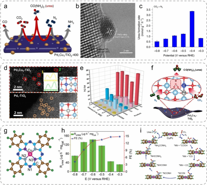 图2.(a)Pd1Cu1/TiO2-400电催化共还原CO2和N2制尿素示意图,(b)相应的TEM图像和(c)催化性能;(d)双原子Pd1Cu1-TiO2和单原子Pd1-TiO2的HAADF-STEM图像及相关原子结构(插图),(e)Pd1Cu1-TiO2的催化性能和(f)相应的示意图;(g)CuPc的分子结构和可能的活性位点,(h)相应的催化性能和(i)反应机理。