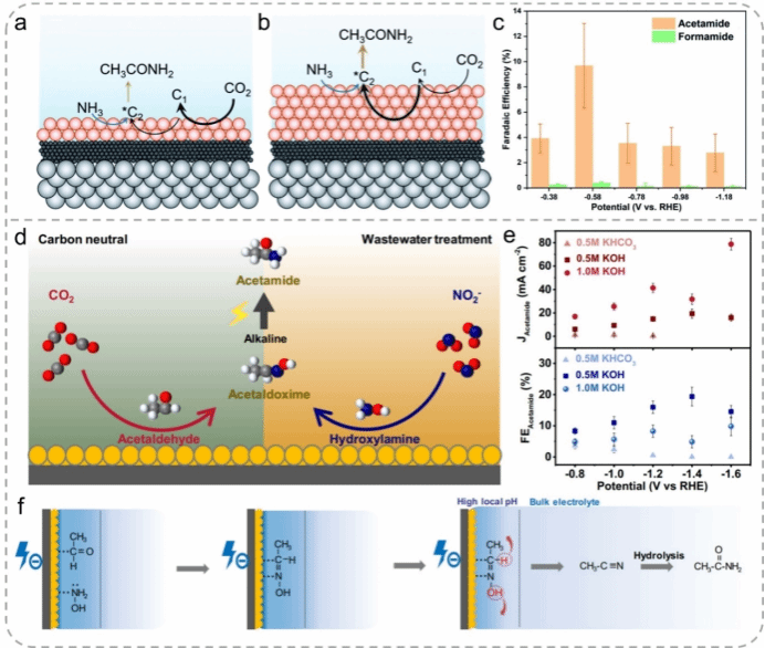 图8.(a)薄层Cu有利于C1产物的形成,而(b)较厚的Cu层促进C-N键的形成,(c)优化的Cu层电催化制备酰胺的性能;(d)CO2和亚硝酸盐生产乙酰胺的图示,(e)电催化性能,(f)乙酰胺生成反应过程示意图和相应的中间体。