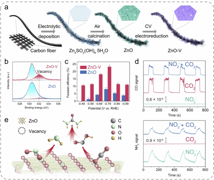 图4.(a)ZnO-V多孔纳米片的合成示意图,(b)ZnO和ZnO-V多孔纳米片上不同电位下尿素的O 1s XPS和(c)FE,(d)ZnO-V上CO和NH3信号的在线DEMS谱图,(e)利用ZnO-V电催化合成尿素的示意图。
