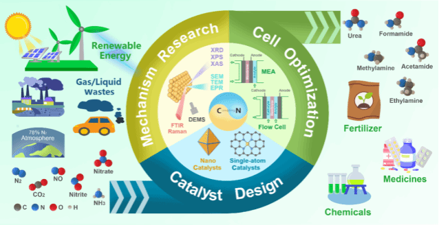 化石燃料燃烧排放的二氧化碳(CO2)是一种温室气体,会导致气温升高,并引发相关的环境和社会问题,对人类生活产生深远影响。因此,迫切需要捕获和利用二氧化碳,以减轻和平衡其在大气中的浓度。胺洗涤目前是一种强大而成熟的CO2捕获技术,为下游工业规模的CO2利用铺平了道路。同时,太阳能和风能等可再生能源的发电量快速增长,由于这些能源是一种间歇性能源,这就突出了与电力储存相关的问题。电催化转化CO2和含氮物质作为一种有效的解决方案,它不仅能够储存电能,还能够制备高附加值的C-N偶联产物。在含氮物种中,氮气(N2)因其丰富储量而成为一个有吸引力的选择,其约占地球大气含量的78%。此外,一氧化氮(NO)是汽车、工厂和发电厂燃烧化石燃料排放的一种污染气体,也可以作为含氮物质。除气含氮源外,水溶性无机阴离子,如亚硝酸盐(NO2−)和硝酸盐(NO3−)也在N循环电催化中得到了广泛的研究,也可以被用于电催化合成C-N偶联产物。