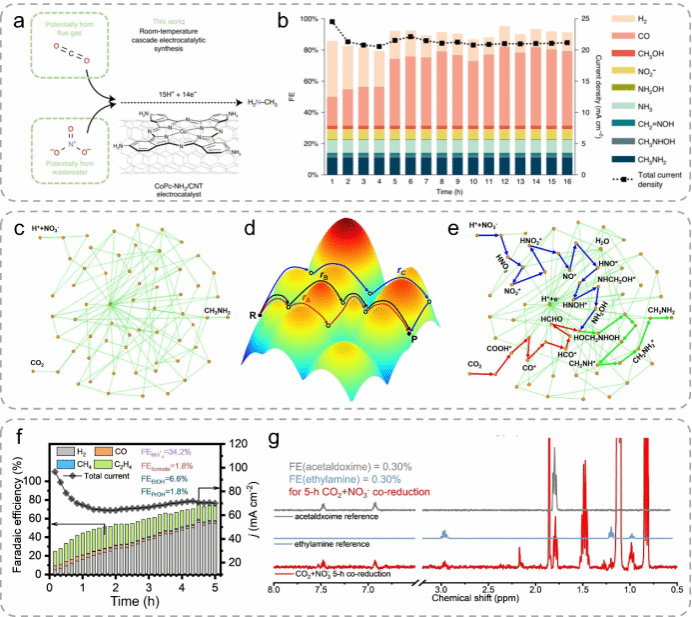 图9.(a)电还原CO2和NO3−制备甲胺示意图,(b)稳定性试验时的产品分布和总电流密度;(c)电还原CO2和NO3−生成甲胺的复杂反应网络,(d)通过全局能量优化的最佳途径,其中越红表示能量越高,(e)红色、蓝色和绿色箭头连接甲胺形成的途径;(f)共还原CO2和NO3−的产物分布和总电流密度,(g)电解后溶液的1H NMR谱图。