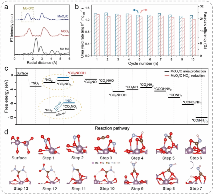 图7. 氧化钼纳米团簇电合成尿素。(a)MoOx/C的EXAFS谱,(b)稳定性循环试验,c)MoOx/C电催化合成尿素的吉布斯自由能变化图和(d)每个步骤的原子构型示意图。