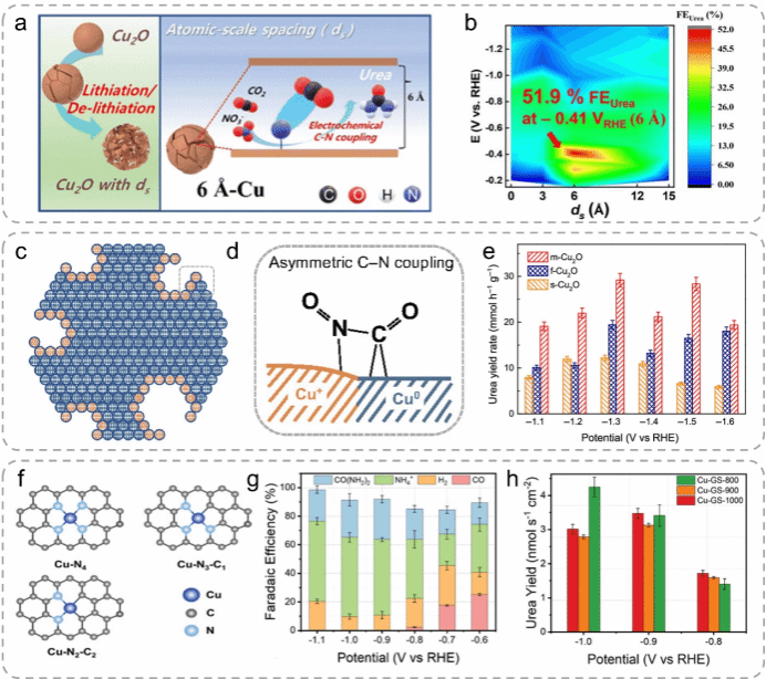 图5. 共还原CO2和NO3合成尿素的Cu基单金属电催化剂。(a)Cu催化剂合成尿素的示意图,(b)电催化性能比较;(c)保留Cu+组分的多孔Cu2O球体,(d)Cu0-Cu+位点促进C-N偶联,(e)尿素合成的电催化活性;(f)傅里叶转化的EXAFS在Cu K-edge上用于Cu单原子催化剂,(g)Cu-GS-800的电催化活性,(h)制备尿素的性能比较。