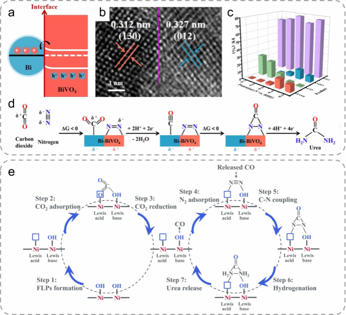 图3. (a)具有Mott-Schottky异质结构的Bi-BiVO4电荷转移过程示意图,(b)相应的TEM图像,(c)催化性能,(d)电催化尿素合成的反应机理;(e)CO2和N2在Ni3(BO3)2-150催化剂FLPs上电催化共还原制备尿素的示意图。