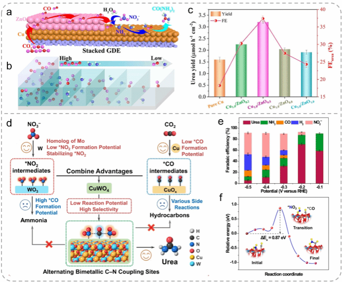 图6. Cu基双金属电催化剂共还原CO2和NO3−合成尿素。(a)串联Cu/ZnO 气体扩散电极示意图,(b)*CO和*NH2中间体浓度沿Cu GDE的分布,(c)Cu/ZnO GED的电催化活性;(d)CuWO4催化剂双金属位点示意图,(e)CuWO4的电催化活性,(f)C-N偶联反应机理。