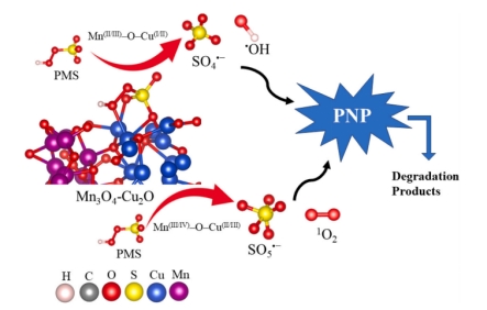 高效、环保的催化剂是激活过一硫酸氢盐(PMS)降解水介质中有机污染物所必需的。铜基和锰基材料因毒性低、丰度高等优势,在PMS催化活化降解酚类有机污染物领域得到广泛研究。单一过渡金属氧化物离子浸出量高,且在反应过程中生成高价态物种导致其循环性差,活性低。在这项研究中,我们开发了一种新方法制备双金属MnCu催化剂,该催化剂由四方Mn3O4和立方Cu2O组成,这种复合催化剂活化PMS降解对硝基苯酚过程中表现出优异的催化活性。实验和密度泛函理论(DFT)计算数据表明,MnCu催化剂中Mn和Cu的混合价态和强相互作用提高了电子传递效率,促进了电子向PMS的转移,从而快速降解对硝基苯酚。