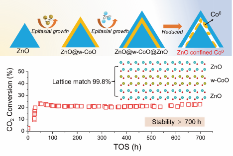 本文提出了一种晶格匹配策略,通过将钴颗粒限域于氧化锌层间(ZnO/Co/ZnO)用于二氧化碳加氢反应。X射线衍射分析表明,氧化锌与六方纤锌矿型CoO(w-CoO)之间的晶格失配度仅为0.18%,这一特性使得w-CoO能够在ZnO表面实现外延生长。同样的,ZnO也能在w-CoO表面外延生长。这种极低的晶格失配为w-CoO在ZnO层间的成功限域提供了基础。这种方法还可适配于不同形貌的ZnO载体,从而实现对限域催化剂微观结构的优化。当钴颗粒被限域于ZnO层间时,催化剂展现出卓越的催化活性,其二氧化碳加氢反应速率达到15.8 μmolCO2·gCo·s-1。更为突出的是,该催化剂在连续运行700小时后仍未见明显失活现象。