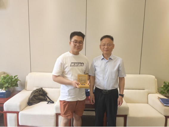罗书记看到学生从“受助者”成长为“追光者”,脸上的笑容就止不住,在分别之际,他向郭家越赠送了玄武岩制作的校徽等礼物,并勉励郭家越多培养自己的兴趣爱好,紧跟时代发展趋势,积极开展交叉学科研究,发挥模范带头作用,努力成为纺大优秀校友,立志成为纺大的杰出校友,展现出纺大人奋勇争先的精气神。