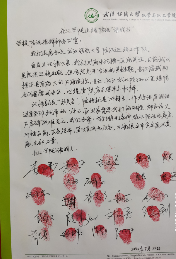 7月23日,一封按满红手印的防汛巡堤“请战书”递交到学校防汛指挥部办公室,一个一个红手印展示的是每一个党员干部的颗颗红心。在学院党委的号召下,tyc8722太阳集团城22名党员干部响应党的号召,主动请缨,积极投身防汛巡堤一线,充分发挥党员先锋模范作用,不怕苦,不怕累,主动担当,敢打头阵。