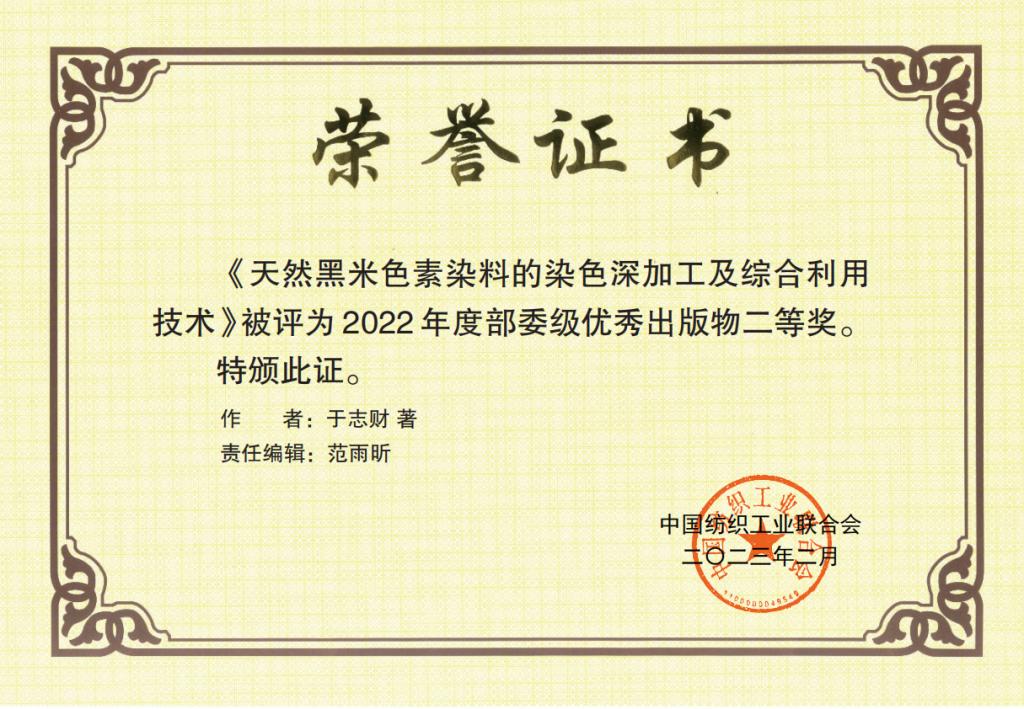 近日,2022年度中国纺织工业联合会优秀出版物评审活动结果公布,tyc8722太阳集团城于志财特聘教授著作的《天然黑米色素染料的染色深加工及综合利用技术》荣获二等奖。该书是一部基于纺织行业“双碳”目标指引下,将天然色素用于纺织品染色及功能整理研究的新作。