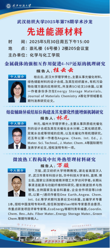 万骏进行了“微波热工程构筑中红外热管理材料研究”的报告,展示了新型热管理材料的构筑策略及其应用前景。林元作了题为“熔盐辅助异质结原位构建及其光催化性能增强机制研究”,介绍了异质结材料在光催化领域的构建方法及其性能提升机制。桂云云作了题为“金属载体的强相互作用促进4-NP还原的机理研究”的报告,探讨了金属与载体之间相互作用对催化反应的促进效应。