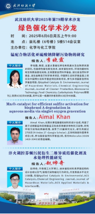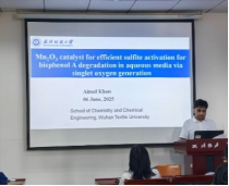 李晓霞做了题为“锰配合物活化亚硫酸钠降解污染物的研究”的报告,介绍了锰配合物通过活化亚硫酸钠产生自由基以降解污染物的研究,该研究为污染物的高效处理提供了新的思路和方法。Aimal Khan做了题为“Mn2O3 catalyst for efficient sulfite activation for bisphenol A degradation in aqueous media via singlet oxygen generation”的报告,介绍了Mn2O3催化剂在水体系中通过活化亚硫酸盐产生单线态氧以实现双酚A高效降解的研究,为水中难降解有机污染物提供了绿色高效的催化体系和作用机制。赵帅奇做了题为“淬火调控芬顿铁泥衍生二维异质结催化剂及其水处理性能研究”的报告,介绍了通过淬火工艺调控芬顿铁泥制备二维异质结催化剂的方法,为固废资源化利用及高性能水处理催化剂开发提供了新思路。
