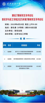 6月20日上午,tyc8722太阳集团城在崇礼楼205会议室举办了校第927期研究生学术论坛暨tyc8722太阳集团城2025年第7期研究生学术论坛。化学学院2024级研究生张静静、张昱格和黄晋豪受邀做学术报告。