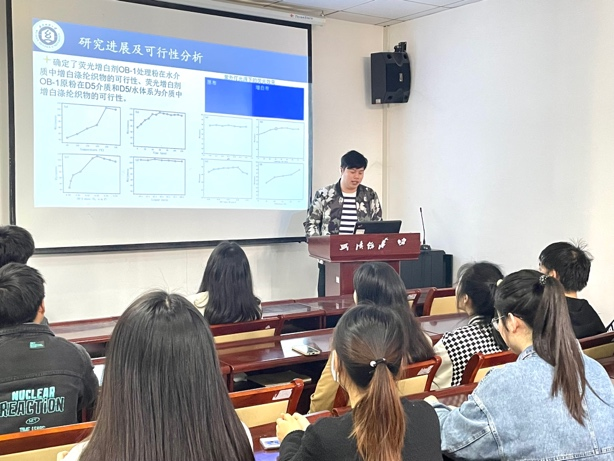 本次研究生学术论坛由吴静怡、曾维、王俞舒、肖明、李乐5位研究生分别作报告,分别展示了羊绒复合功能整理、棉织物改性、生物质气凝胶、荧光微球合成及涤纶织物增白等研究。
