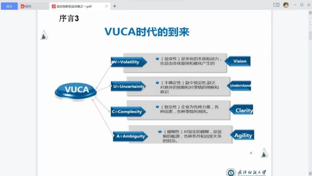 干德超指出,我们处于“VUCA”时代,具有易变形、不确定性、复杂性、模糊性,因此我们会对未来迷茫,那我们如何才能不迷茫呢?干德超提了三点建议:第一在不确定中寻找可为的确定,不要把不确定当确定;第二在“运动”之中寻找“战机”,走出去,去实践;第三给自己五年的时间来认识自己、了解社会,然后再定位,有些事情看上去很有兴趣,但未必做的得心应手。