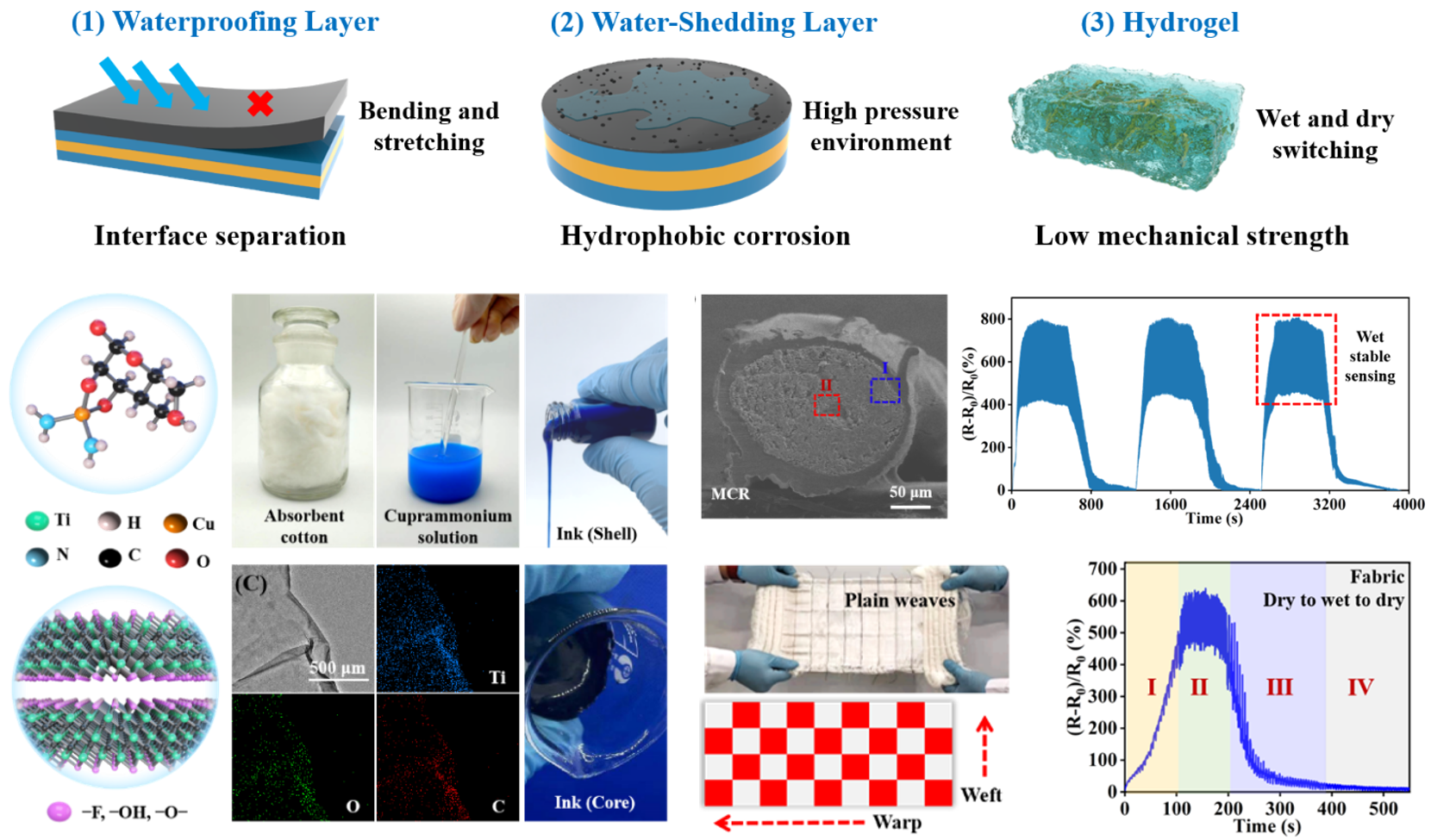 在极端水环境中,柔性水下应变传感器作为多场景关键部件,在深海勘测、两栖装备、智能穿戴系统等高端应用中承担核心信息获取功能。现有器件普遍依赖外覆防水封装层实现水相隔离,尽管短期稳定,但在长期服役与频繁干湿循环条件下易出现热胀冷缩引起的界面剥离、电子失效与结构变形等问题,严重限制了器件在高湿腐蚀、动态负载等复杂环境下的适应性。因此,如何构建一种本征具备“水相相容性”且可在干湿转换中维持界面完整性与电学连续性的功能材料体系,是当前高性能水下传感器发展的关键科学挑战。