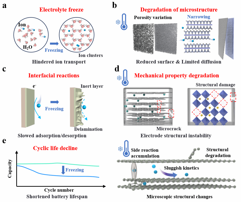 在极地勘测、深空探测与高寒地区能源保障等场景中,能源存储系统需在–40°C甚至更低温度下仍保持稳定性能。然而,低温环境显著抑制电解质离子迁移率、电极界面电荷传输效率及材料柔性结构的完整性,导致器件易出现容量骤降、界面失稳与循环寿命严重受限的问题。现有材料系统虽在低温电解质、电极活性物质开发等方面取得进展,但整体器件层级的结构优化与高集成度制造能力仍显不足,亟需新的制造范式支持材料–结构–功能的一体化耦合调控。