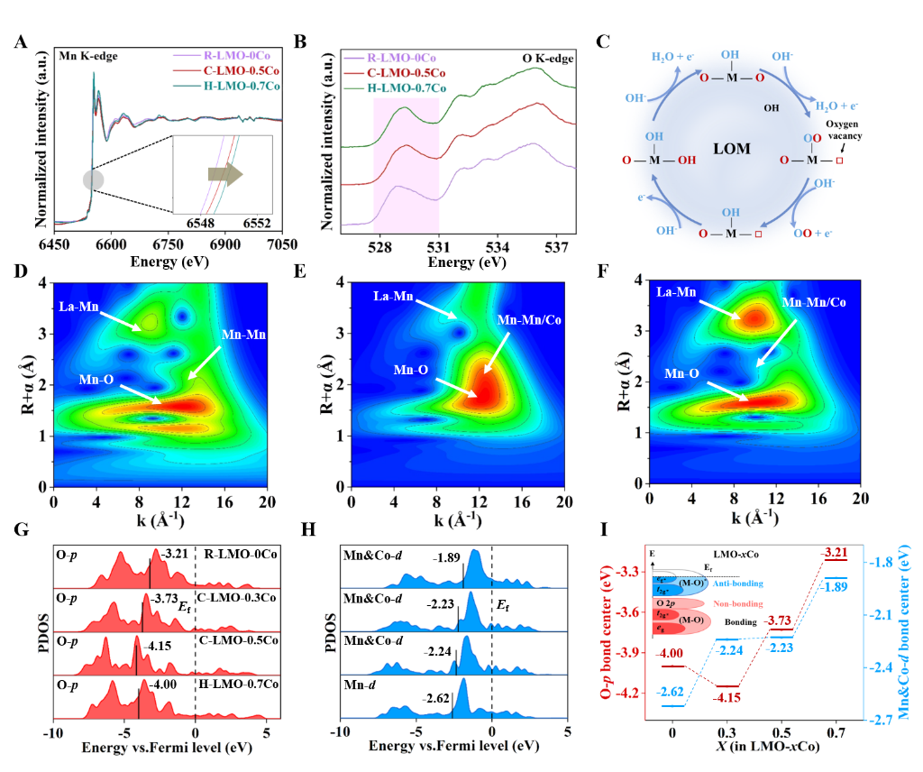 为突破二维催化剂在极端环境下的稳定性难题,本研究提出基于“恒温非平衡微波诱导+元素掺杂调控”的晶相演化策略,在不依赖高温退火的条件下,利用Co元素掺杂驱动LaMnO3由稳定菱方相向非常规立方相稳定转化,并保持其二维多孔结构的完整性与高反应表面积。该过程中,Co掺杂不仅调控Mn-O电荷分布和键长变化,增强了晶格氧激发能力,还协同提升了晶体对Cl⁻攻击的电荷缓冲能力。所构建C-LMO材料在碱性海水体系中展现出长期稳定的OER催化性能,在高腐蚀性环境中维持电位稳定与结构完整性,表现出工程级的耐久性与抗失活能力。本研究确立了面向复杂环境的二维非贵金属催化剂低温合成与非热力学晶相稳定范式,为发展适配工业级海水电解反应的先进钙钛矿材料提供了具有推广性的构筑方法与性能支撑。
