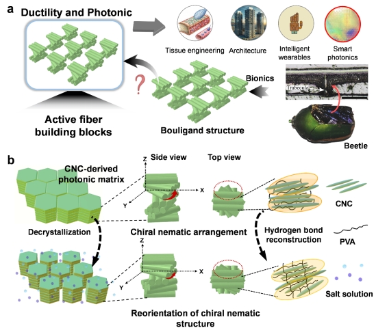 在另一项发表于《Materials Today》的研究中,张福生博士与中国科学院大连化学物理研究所卿光焱研究员合作,成功开发出具有动态机械变色特性的光子Bouligand结构水凝胶。该研究通过结晶域还原和链重构技术重新定向CNC手性向列结构(图1),实现了材料性能的重大突破。