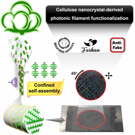 在发表于《ACS NANO》的研究中,课题组创新性地提出“限域自组装”策略,成功开发出响应性光子纤维素纳米晶体细丝。该研究突破了传统纤维素产品应用边界,为智能纺织品和可穿戴传感设备领域带来新的发展机遇(图1)。
