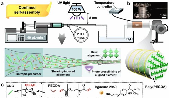 研究团队采用连续受限自组装机制,结合剪切力驱动取向、快速光化学交联反应和湿纺丝技术,成功克服了纤维素纳米晶体(CNC)在手性光子丝制备中的技术瓶颈(图2)。通过优化加工参数并应用热处理强化CNC分子内氢键,课题组制备出长度超过30米、直径约160微米的光子丝,同时保留了左旋手性向列结构。