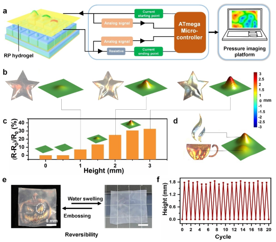 新型光子水凝胶展现出卓越的机械性能:拉伸性超过950%,韧性高达155.5 MJ∙m−3。同时,材料表现出427 nm波长偏移的可逆颜色变化,并在宽幅机械拉伸范围内保持渐进式电传感响应。特别值得一提的是,研究团队成功将水凝胶集成到微控制器中,构建了机械成像平台,通过光学和电子双信号报告性能实现压力分布的视觉定位(图2)。