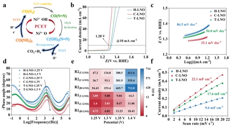 如图4所示,立方相LaNiO3(C-LNO)在1 M KOH和0.33 M尿素条件下表现出优异的催化活性,具有最低的起始电位(1.28 V)和显著的电流密度提升,表明其催化反应优于其他晶相的LaNiO3。Tafel斜率分析进一步揭示了C-LNO具有最快的反应动力学(33.1 mV dec⁻¹)。电化学阻抗谱显示C-LNO在高频区的相角显著降低,且Nyquist图中半圆直径较小,表明其优越的电荷转移能力和低反应阻抗。